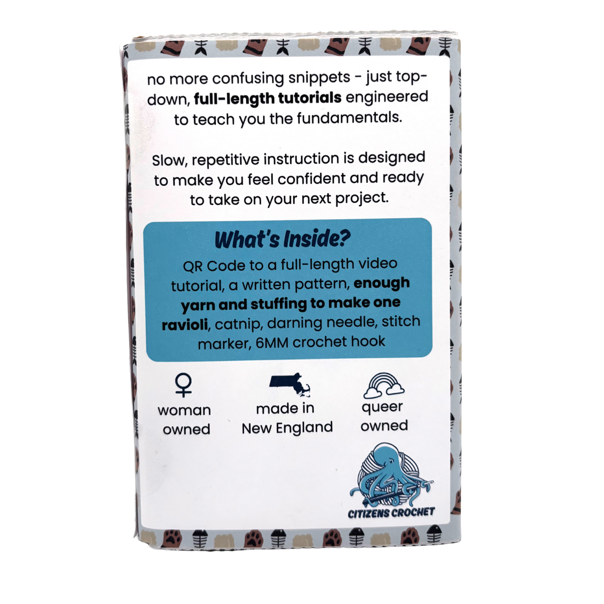 1 4MM crochet hook, 1 tapestry needle, 1 stitch marker, 1/4 tsp of catnip, enough yarn and stuffing to make one catnip ravioli, written pattern, QR code to a video pattern.